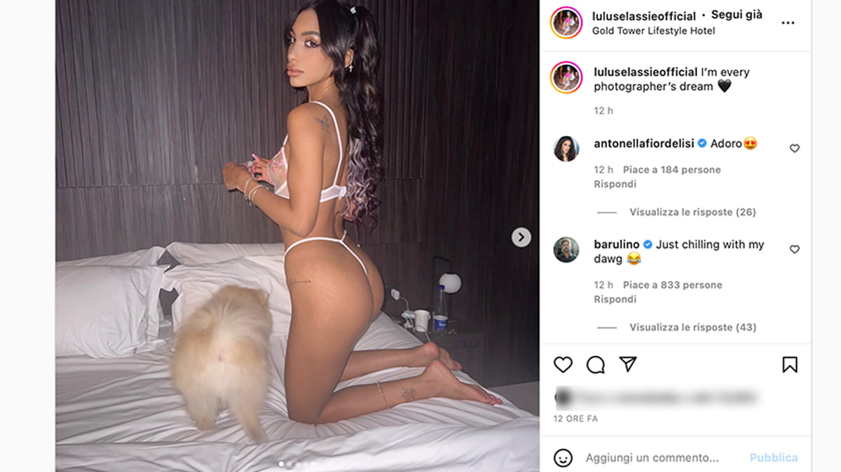 La principessa dopo la rottura definitiva con il nuotatore Manuel che ha conosciuto all’interno della casa del Grande Fratello si sta godendo la sua estate. Spesso si mostra non solo con le sue classiche lentiggini e orecchiette ma anche in costumi molto sexy che coprono giusto il necessario. Questa volta però la principessa etiope ha deciso di “esagerare”. La principessa mostra uno scatto che le è stato fatto al Gold Tower Lifestyle Hotel in cui indossa solo lingerie. Nella caption della foto scrive “I’m eveery photographer’s dream” che tradotto è “sono il sogno di ogni fotografo”. Lulù in compagnia del suo cucciolo si mostra con un perizoma da capogiro che lascia poco spazio all’immaginazione. Tra i vari commenti spunta quello di un ex coinquilino della casa.