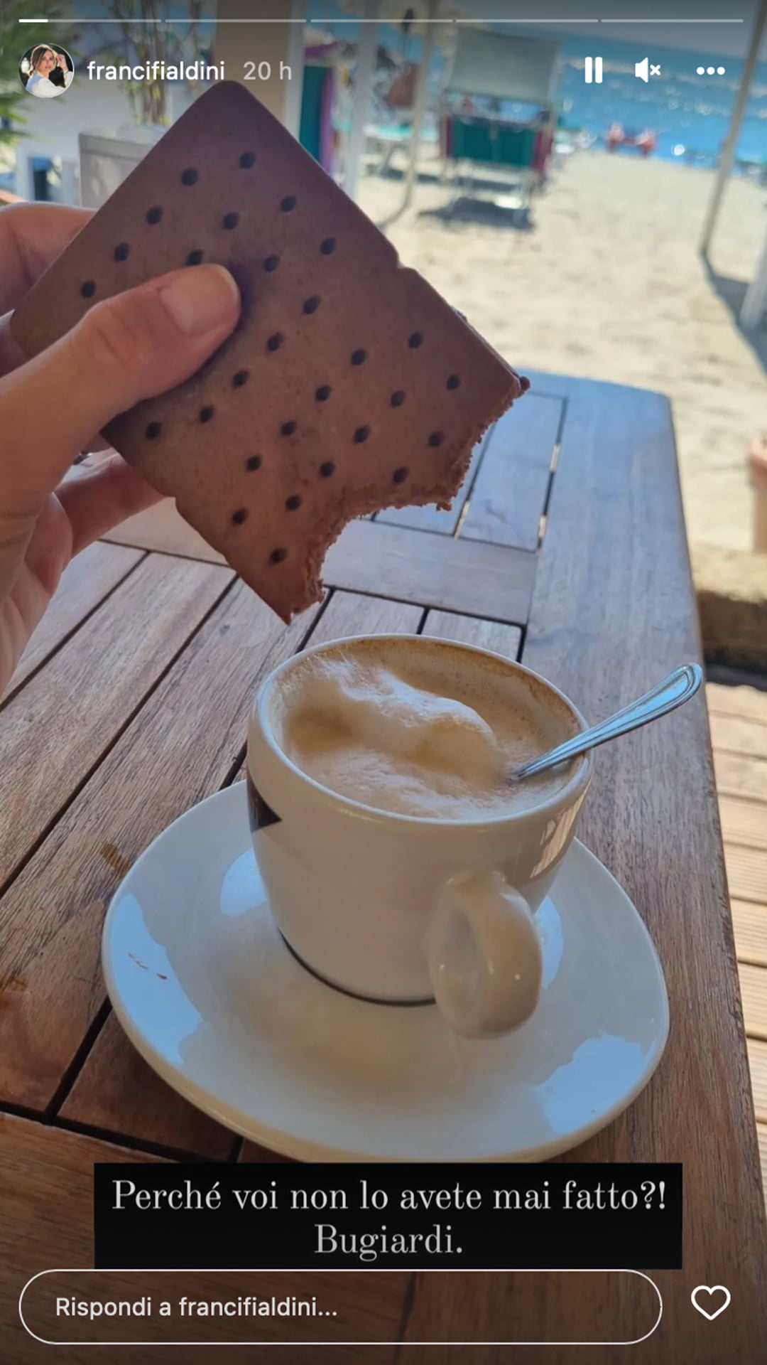 Più che un suggerimento, un’abitudine alimentare. In una storia Instagram pubblicata poco fa, la conduttrice toscana ha fotografato la sua ricca colazione in un bar vicino al mare. Analizzando attentamente la foto, si intuisce chiaramente che la Fialdini abbia “inzuppato” un biscotto nel cappuccino. La didascalia della storia è una vera e propria provocazione nei confronti dei fan. “Perché voi non lo avete mai fatto?! Bugiardi” scrive la presentatrice. E come contraddirla: chi non ha mai inzuppato un goloso biscotto al cioccolato nella morbida schiuma di latte del cappuccino? Una goduria!
