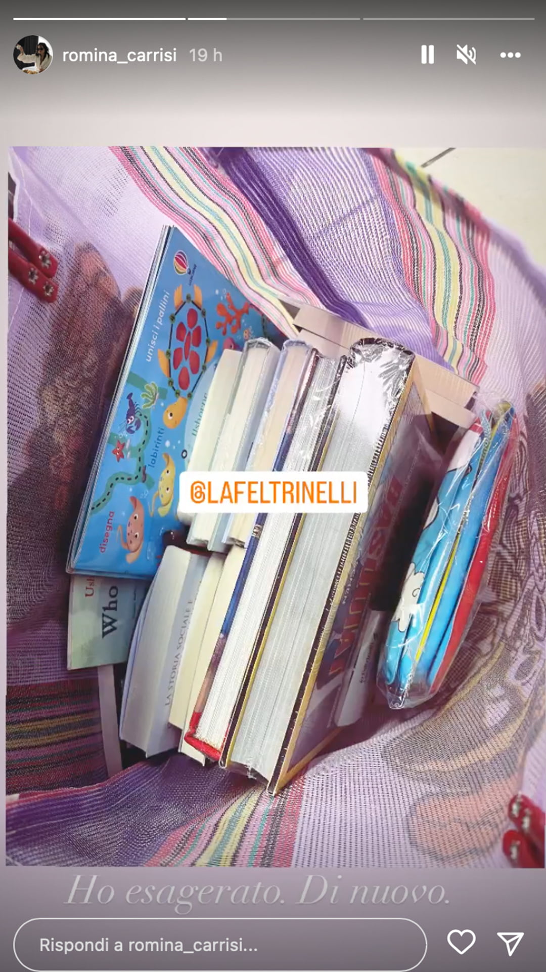 Niente sole e mare dunque per la giovane Carrisi, che si sta dedicando ad un hobby che l’ha portata ad esagerare un tantino. Come si può chiaramente vedere nelle sue storie su Instagram, la terzogenita di Al Bano ha acquistato una grossa quantità di libri in una famosa catena italiana. Lei stessa ha asserito di aver ‘forse’ esagerato, mostrando la busta che contiene il bottino acquistato nella giornata di ieri. Sicuramente serviranno a trascorrere giorni di relax e riflessione in questo rovente agosto. Attendiamo l’inizio si settembre e i probabili impegni professionali o gossip che alimenteranno la vita dei Carrisi: porteranno la ragazza fuori dall’Italia o ancora a Cellino?