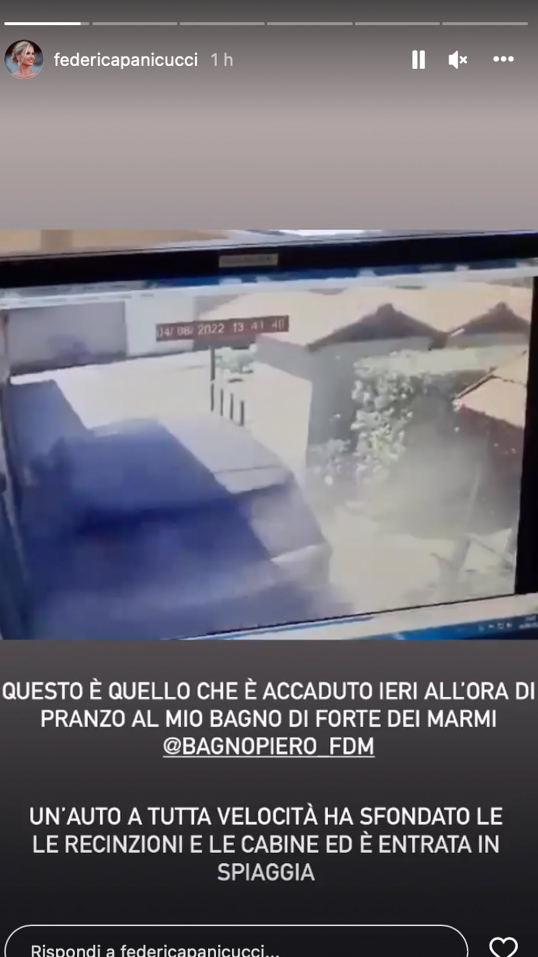 Il primo video che pubblica Federica Panicucci nelle sue storie riprende due donne camminare nei pressi di un parcheggio di uno stabilimento balneare famosissimo a Forte dei Marmi. È lo stesso dove si reca anche la conduttrice. Dalle telecamere di sicurezza si nota le due donne passeggiare ieri ad ora di pranzo. Non appena hanno girato l’angolo un suv a tutta velocità ha sfondato la recinzione distruggendo le cabine ed entrando in spiaggia.
