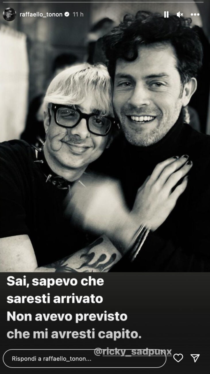 Le parole dedicate a Ricky sembrano a tutti gli effetti una dichiarazione d’amore. Rick Sadpunx è un profilo Instagram con circa 500 follower. Dalle foto notiamo che il ragazzo sfoggia spesso look parecchio appariscenti. Anche Amedeo Venza, esperto di gossip, postando uno screenshot di questa Storia, ha sentenziato: “Tonon si è accoppiato!”. Si tratta del tanto atteso coming out dell’opinionista di Barbara D’Urso? Di sicuro c’è che lui finora non aveva mai postato sui social foto simili. Il giovane Ricky lo ha ripostato, aggiungendo una canzone rock italiana “Prenditi cura di me”.