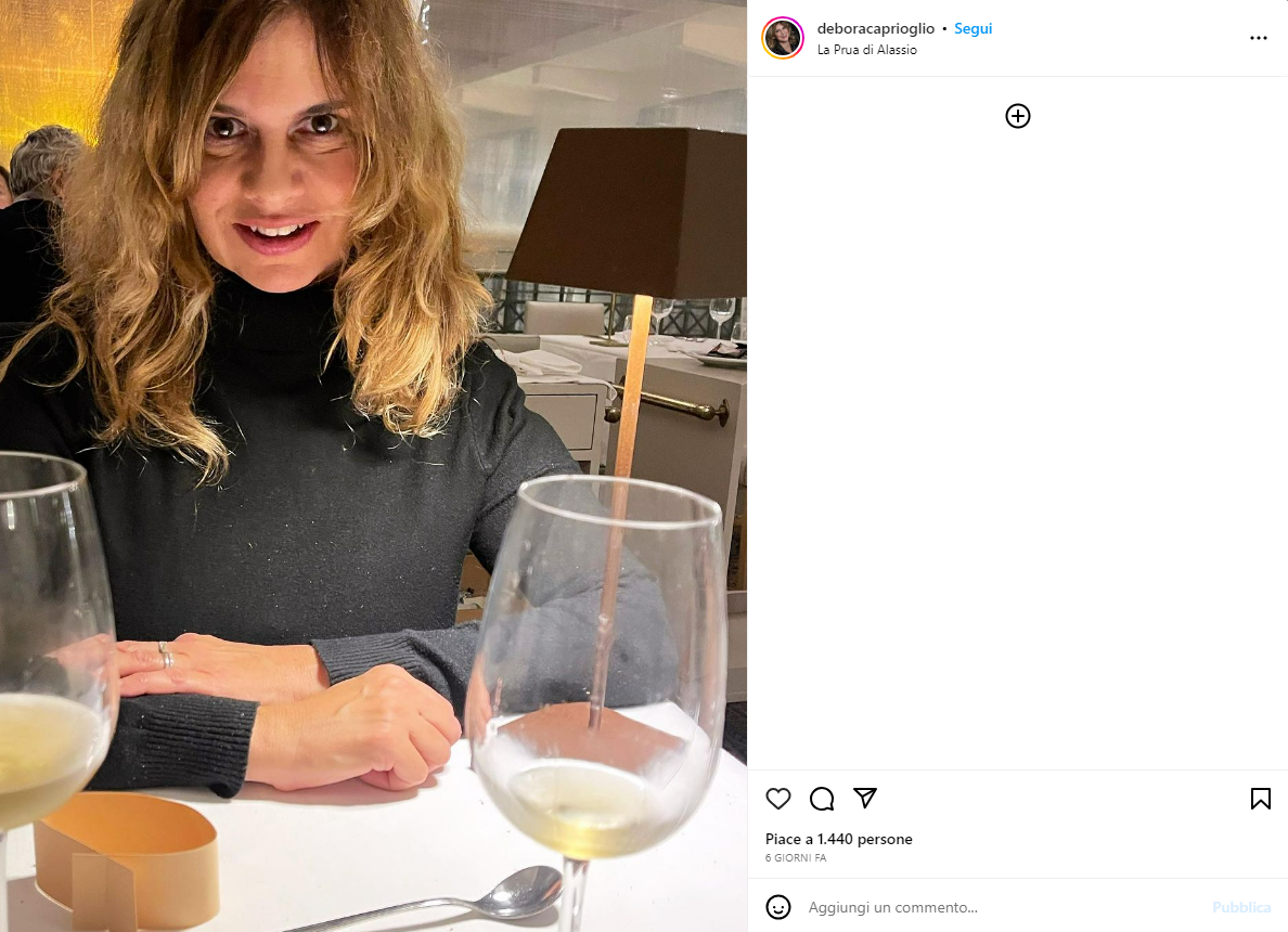 Curiosamente, nonostante la sua fama, il profilo Instagram di Debora Caprioglio non è verificato. Tuttavia, questo non le impedisce di condividere momenti della sua vita con i fan. L’ultima foto pubblicata, risalente a sei giorni fa, la ritrae sorridente al ristorante “La prua” di Alassio, in compagnia di due bicchieri di buon vino. Questo scatto offre uno spaccato della sua vita attuale, lontana dai riflettori ma ancora piena di quel calore e quella genuinità che l’hanno sempre contraddistinta.