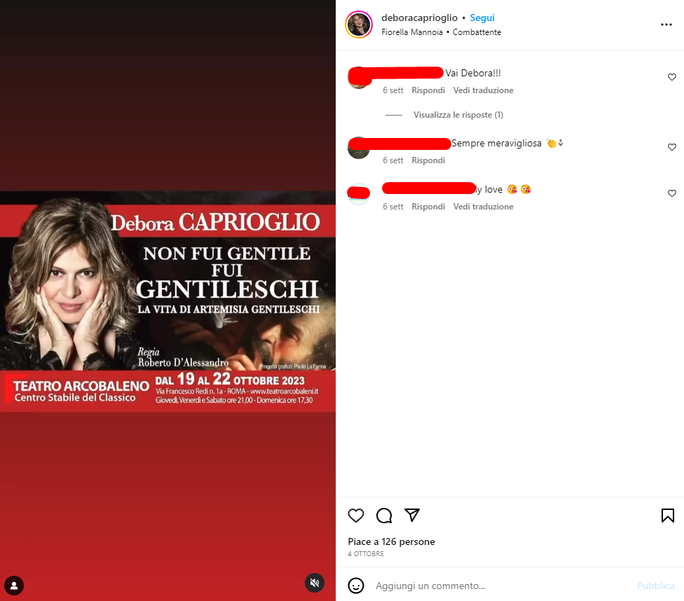 Recentemente, Debora Caprioglio ha incantato il pubblico con la sua partecipazione allo spettacolo teatrale “Non fui gentile ma gentileschi”, ispirato alla vita di Artemisia Gentileschi. Questa performance ha rivelato ancora una volta il suo talento nel dare vita a personaggi storici, dimostrando una capacità di immedesimazione e una presenza scenica che pochi possono vantare.