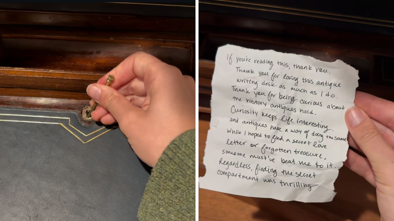 Con un piccolo pin (un oggetto lungo e sottile) inserito in un punto preciso del mobile, la scrivania ha finalmente rivelato il suo segreto: una porzione di legno si è sollevata, rivelando tre cassetti nascosti rimasti chiusi probabilmente per più di un secolo. La scena, ripresa in diretta e pubblicata su Instagram @peachybeeantiques, ha superato in poco tempo un milione di visualizzazioni, lasciando tutti a bocca aperta. In uno dei tre cassetti ‘segreti’ c’era un bigliettino scritto a mano dalla stessa Peachybeeantiquest in cui ringrazia tutti coloro che hanno visto il video fino alla fine, mostrando dunque “curiosità” nei confronti dell’oggetto, aggiungendo che la curiosità rende la vita più interessante. “Speravo di riuscire a trovare una lettera d’amore, ma credo che qualcuno ci sia arrivato prima di me”, recita il bigliettino scritto a mano trovato nel terzo cassetto. Quello centrale è stato impossibile da aprire perché il mini pomello di ottone è saltato.