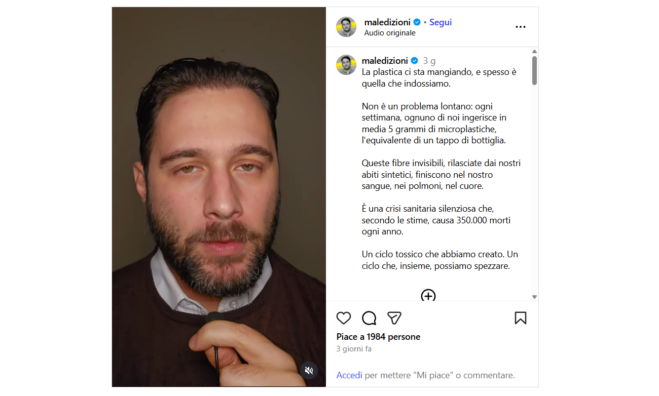 Il reel non vuole essere moraleggiante. È un frammento di realtà raccontato attraverso una voce che parla senza filtri. Una testimonianza che non può risolvere il problema delle microplastiche, ma può almeno fare ciò che oggi serve di più: costringerci a guardarlo in faccia.