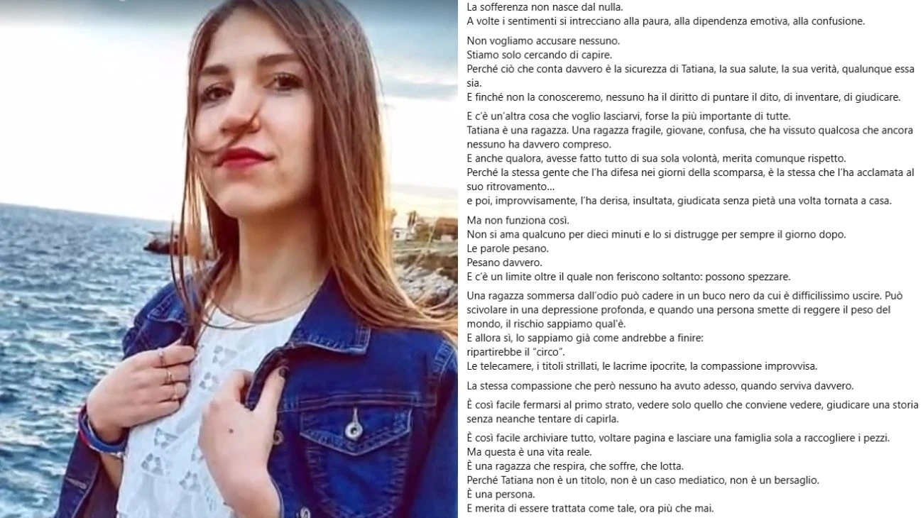 Quel che tutti sembrano aver dimenticato è che, continua Lorenzo, “ciò che conta davvero è la sicurezza di Tatiana, la sua salute, la sua verità, qualunque essa sia”. “Tatiana non è un titolo, non è un caso mediatico, non è un bersaglio. È una persona. E merita di essere trattata come tale, ora più che mai”.