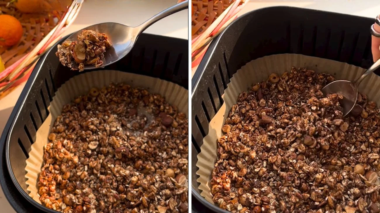 Sono tantissime le ricette virali che riguardano la colazione e che si abbinano perfettamente anche alla granola che possiamo aggiungere ovunque. Per preparare questa granola il procedimento è semplicissimo. Prendiamo il cestello della friggitrice ad aria o una teglia da forno rivestita con carta e versiamo tutti gli ingredienti a cominciare dai cereali soffiati, i fiocchi di avena, la frutta secca o la crema spalmabile, gli aromi come il cacao e per concludere un cucchiaio abbondante di miele. Mescoliamo per bene tutti gli ingredienti e posizioniamoli su una teglia in forno o in friggitrice ad aria.