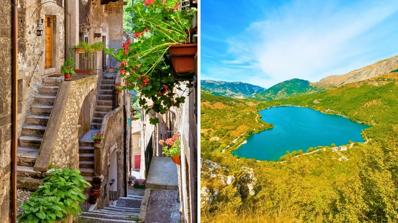 Il borgo di Scanno con il suo lago a forma di cuore sono uno dei luoghi più affascinanti da vedere in Abruzzo in primavera.