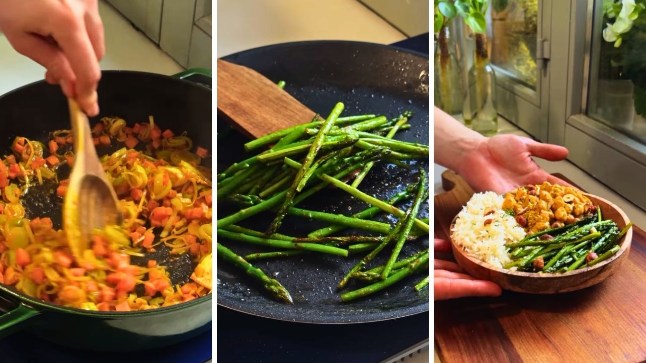 Prima di tutto, lo chef taglia i porri a rondelle e le carote a dadini. Poi, in una casseruola con l’olio, fa tostare la paprika, il cumino, il curry e la curcuma, e poi fa saltare le verdure prima citate in questa casseruola, insieme a qualche spicchio d’aglio e a dello zenzero grattugiato. Dopo aver fatto tostare per bene le verdure, aggiunge il concentrato di pomodoro, e mescola tutto. Quando il soffritto sarà pronto, dopo circa 5-10 minuti, bisognerà aggiungere i ceci, e farli cuocere insieme a del latte di cocco. Aggiungete, poi, il pepe, per avere dei ceci al curry fantastici. Nel frattempo, tagliate gli asparagi e brasateli in padella, con del burro chiarificato, e preparate il riso basmati.